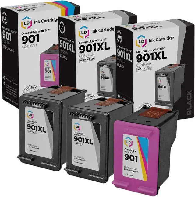 Save even more with our 3 pack of professionally remanufactured HP 901 inkjet cartridges. This set includes 2 HP CC653AN 901 black cartridge, and 1 HP CC656AN 901 color cartridge. These LD Products remanufactured ink cartridges have been thoroughly cleaned along with the printhead nozzles. Following the cleaning process, we refilled the cartridge with a professionally manufactured pigment-based ink formula for archival print life and color stability. This ink formula is specially designed to produce vibrant and long-lasting prints comparable to HP. After carefully inspecting the shell for leakage and monitoring the electrical circuitry for efficiency, we put the cartridge through a final print test to be certain it is ready to perform.