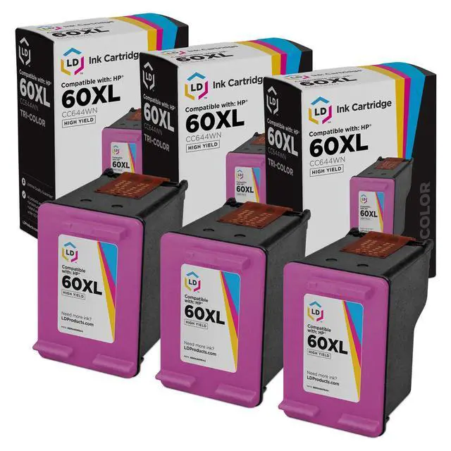 Save even more with our set of 3 HP 60XL CC644WN high yield color inkjet cartridges. These LD remanufactured ink cartridges have been thoroughly cleaned along with the printhead nozzles. Following the cleaning process, we refilled the cartridge with a professionally manufactured pigment-based ink formula for archival print life and color stability. This ink formula is specially designed to produce vibrant and long-lasting prints comparable to HP. After carefully inspecting the shell for leakage and monitoring the electrical circuitry for efficiency, we put the cartridge through a final print test to be certain it is worth of our 100% money-back guarantee. Our remanufactured ink cartridges are not remanufactured by HP. So Stock up now and save even more! For use in the following printers: PhotoSmart C4680, PhotoSmart C4685, Deskjet F4240, PhotoSmart C4799, Deskjet F4480, Deskjet F4210, Deskjet F4440, Deskjet F4288, Deskjet D2545, PhotoSmart C4780, Deskjet D1660, Deskjet F4283, Deskjet D2568, Deskjet D2530, Deskjet D2560, PhotoSmart C4640, Deskjet D1663, Deskjet D2660, Deskjet F4213, Deskjet F4250, Deskjet F4230, Deskjet F4272, Deskjet D2563, PhotoSmart C4690, Deskjet F4450, PhotoSmart C4795, PhotoSmart C4683, PhotoSmart C4650, Deskjet D2680, Deskjet F4275, Deskjet F4235, Deskjet D2566, Deskjet F4280, PhotoSmart C4635, PhotoSmart C4610, Deskjet D2645, PhotoSmart C4783, PhotoSmart C4750, PhotoSmart C4740, Deskjet F4435, Deskjet D2663, Deskjet F4293, Deskjet F4292, Deskjet F4274, Deskjet F4273, Deskjet F2400, Deskjet F2493, Deskjet F2492, Deskjet F2488, Deskjet F2483, Deskjet F2480, Deskjet F2430, Deskjet F2423, Deskjet F2420, Deskjet F4400, PhotoSmart C4700, PhotoSmart C4600. We are the exclusive reseller of LD Products brand of high quality printing supplies on Newegg.