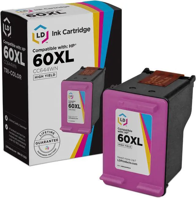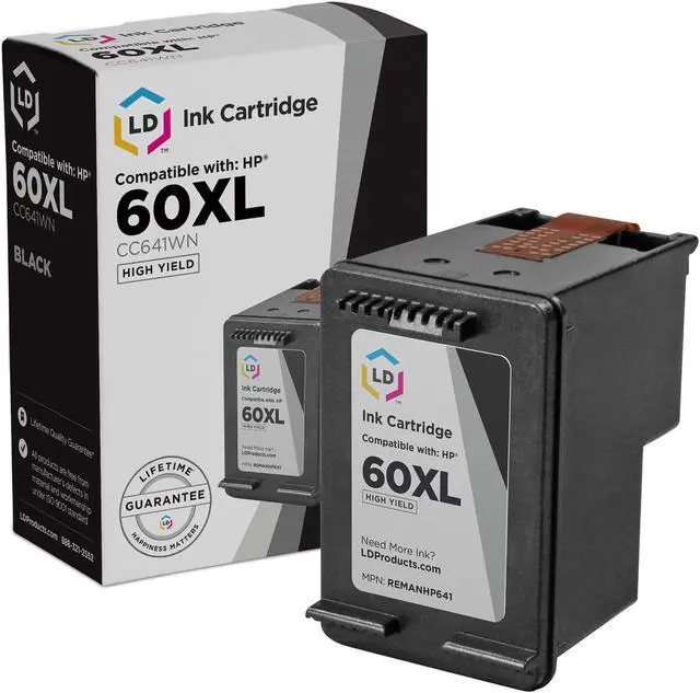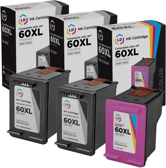 Save even more with our 2 pack of professionally remanufactured HP 60XL inkjet cartridges. This set includes 2 HP CC641WN high yield black cartridges, and 1 HP CC644WN high yield color cartridge. These LD remanufactured ink cartridges have been thoroughly cleaned along with the printhead nozzles. Following the cleaning process, we refilled the cartridge with a professionally manufactured pigment-based ink formula for archival print life and color stability. This ink formula is specially designed to produce vibrant and long-lasting prints comparable to HP. After carefully inspecting the shell for leakage and monitoring the electrical circuitry for efficiency, we put the cartridge through a final print test to be certain it is worth of our 100% money-back guarantee. Our remanufactured ink cartridges are not remanufactured by HP. This combo set works with the following HP Printers: PhotoSmart C4680, PhotoSmart C4685, Deskjet F4240, PhotoSmart C4799, Deskjet F4480, Deskjet F4210, Deskjet F4440, Deskjet F4288, Deskjet D2545, PhotoSmart C4780, Deskjet D1660, Deskjet F4283, Deskjet D2568, Deskjet D2530, Deskjet D2560, PhotoSmart C4640, Deskjet D1663, Deskjet D2660, Deskjet F4213, Deskjet F4250, Deskjet F4230, Deskjet F4272, Deskjet D2563, PhotoSmart C4690, Deskjet F4450, PhotoSmart C4795, PhotoSmart C4683, PhotoSmart C4650, Deskjet D2680, Deskjet F4275, Deskjet F4235, Deskjet D2566, Deskjet F4280, PhotoSmart C4635, PhotoSmart C4610, Deskjet D2645, PhotoSmart C4783, PhotoSmart C4750, PhotoSmart C4740, Deskjet F4435, Deskjet D2663, Deskjet F4293, Deskjet F4292, Deskjet F4274, Deskjet F4273, Deskjet F2400, Deskjet F2493, Deskjet F2492, Deskjet F2488, Deskjet F2483, Deskjet F2480, Deskjet F2430, Deskjet F2423, Deskjet F2420, Deskjet F4400, PhotoSmart C4700, PhotoSmart C4600. We are the exclusive reseller of LD Products brand of high quality printing supplies on Newegg.
