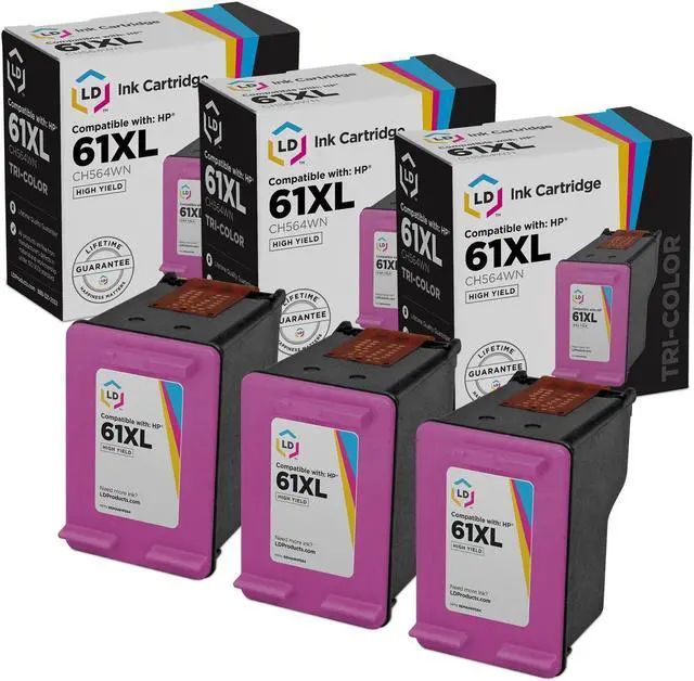 Save and print even more when you shop with LD Products! This offer includes (3) CH564WN / HP 61XL high yield tri-color ink cartridges; they replace the original CH562WN / HP 61 standard yield tri-color ink series. Why pay twice as much for expensive brand name Hewlett Packard ink when our remanufactured printer supplies are backed by a 100% Satisfaction and LIFETIME Guarantee? This ink cartridge set is compatible with HP DeskJet 1000, 1010, 1011, 1012, 1015, 1050, 1051, 1055, 1056, 1510, 1512, 2050, 2510, 2512, 2514, 2540, 2541, 2542, 2543, 2544, 2545, 2547, 2549, 3000, 3050, 3051A, 3051A-J611h, 3052A, 3052A-J611e, 3052A-J611f, 3052A-J611g, 3054, 3054A-J611c, 3054A-J611d, 3054A-J611j, 3055A-J611n, 3056A, 3057A-J611n, 3059A-J611n, 3510, 3511, 3512, 3516 | ENVY 4500, 4501, 4502, 4503, 4504, 4505, 4507, 4508, 4509, 5530, 5531, 5532, 5534, 5535, 5539 and OfficeJet 2620, 4630, 4632, 4634, 4635 printers.