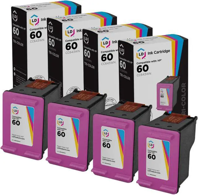 Save even more with our set of 4 HP 60 CC643WN standard yield color inkjet cartridges. These LD remanufactured ink cartridges have been thoroughly cleaned along with the printhead nozzles. Following the cleaning process, we refilled the cartridge with a professionally manufactured pigment-based ink formula for archival print life and color stability. This ink formula is specially designed to produce vibrant and long-lasting prints comparable to HP. After carefully inspecting the shell for leakage and monitoring the electrical circuitry for efficiency, we put the cartridge through a final print test to be certain it is worth of our 100% money-back guarantee. Our remanufactured ink cartridges are not remanufactured by HP. For use in the following printers: PhotoSmart C4680, PhotoSmart C4685, Deskjet F4240, PhotoSmart C4799, Deskjet F4480, Deskjet F4210, Deskjet F4440, Deskjet F4288, Deskjet D2545, PhotoSmart C4780, Deskjet D1660, Deskjet F4283, Deskjet D2568, Deskjet D2530, Deskjet D2560, PhotoSmart C4640, Deskjet D1663, Deskjet D2660, Deskjet F4213, Deskjet F4250, Deskjet F4230, Deskjet F4272, Deskjet D2563, PhotoSmart C4690, Deskjet F4450, PhotoSmart C4795, PhotoSmart C4683, PhotoSmart C4650, Deskjet D2680, Deskjet F4275, Deskjet F4235, Deskjet D2566, Deskjet F4280, PhotoSmart C4635, PhotoSmart C4610, Deskjet D2645, PhotoSmart C4783, PhotoSmart C4750, PhotoSmart C4740, Deskjet F4435, Deskjet D2663, Deskjet F4293, Deskjet F4292, Deskjet F4274, Deskjet F4273, Deskjet F2400, Deskjet F2493, Deskjet F2492, Deskjet F2488, Deskjet F2483, Deskjet F2480, Deskjet F2430, Deskjet F2423, Deskjet F2420, Deskjet F4400, PhotoSmart C4700, PhotoSmart C4600. We are the exclusive reseller of LD Products brand of high quality printing supplies on Newegg.