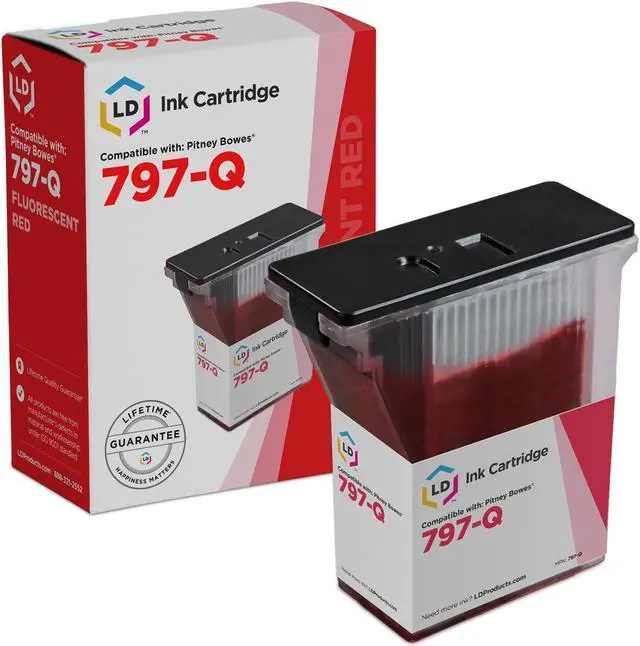 Save even more with our compatible inkjet cartridge. This item includes 1 797-Q fluorescent red inkjet cartridge. Why pay more for brand name Pitney Bowes 797-Q cartridge? Our compatible brand replacement ink cartridges for Pitney Bowes are built to perform. So stock up now and save even more! This item works in the following