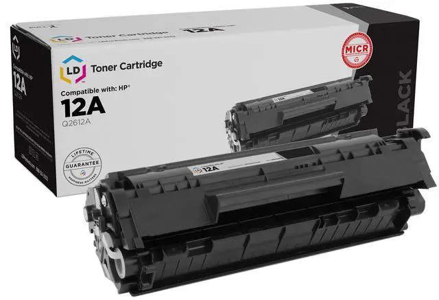 This is a replacement cartridge for the Hewlett Packard Q2612A MICR (12A) black laser toner cartridge which is manufactured by LD and is guaranteed to perform with your HP printer. It replaces the original HP Q2612A toner cartridge. LD remanufactured replacement Q2612A laser toner cartridges are specially engineered to meet the highest standards of quality and reliability you can expect from LD. They are specifically designed for printing checks, made possible by a special iron in the toner that is detectable at banks. Our toners have exceptional yields that meet or exceed the OEM (Original Equipment Manufacturer) page yield for the Q2612A. Our remanufactured HP 12A contains up to 85% new parts including wiper blades, OPC drums, and other internal components. While most competitors simply refill the toner cartridge and hope the drum and other key components last, we fully disassemble the toner cartridge and rebuild it to ensure the highest quality prints. High quality LD remanufactured Q2612A toner cartridges are an economical and sensible alternative to expensive OEM Q2612A (HP 12A) Hewlett Packard laser toner cartridges and supplies. The use of LD remanufactured replacement laser toner cartridges and supplies does not void your printers warranty. LD remanufactured laser cartridges are not remanufactured by HP. LD Products offers a two year 100% Quality Satisfaction Guarantee on our LD remanufactured Q2612A black laser toner cartridges. For use in the following printers: LaserJet 1020, 1018, 1022, 1012, 3050 All-in-One, 3015, 3055 All-in-One, 1022n, 3030, M1319, 1010, 3052 All-in-One, M1319f, 1022nw, 3020. We are the exclusive reseller of LD Products brand of high quality printing supplies on Newegg.