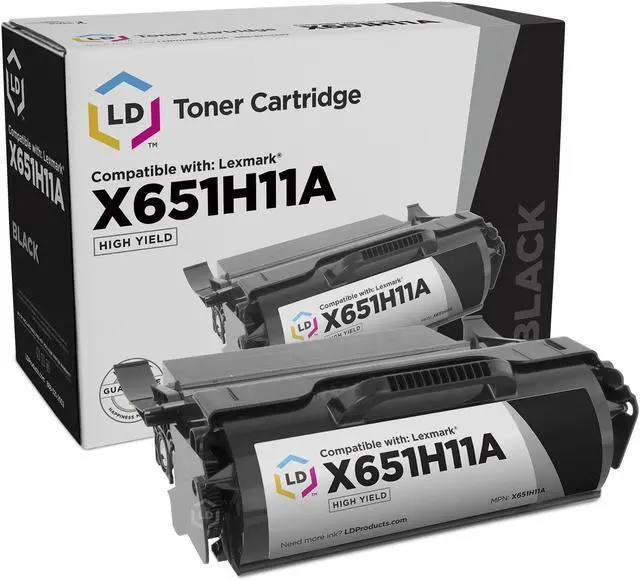 This is a remanufactured Lexmark X651H11A high yield black laser toner cartridge guaranteed to perform with Lexmark laser printers. It replaces the original Lexmark X651H11A laser toner cartridge. The remanufactured replacement X651H11A laser toner cartridges and supplies (also known as generic) are specially engineered to meet the highest standards of quality, reliability and exceptional yields that meet or exceed OEM (Original Equipment Manufacturer) standards for the X651H11A and offer high-quality printing results. Containing up to 60% new parts including wiper blades, and other internal parts, they are an economical alternative to expensive OEM X651H11A Lexmark laser toner cartridges and supplies, and offer big savings over brand-name X651H11A laser toner cartridges and supplies for your X651, X652, X654, X656 or X658 series printer. The use of remanufactured replacement laser toner cartridges and supplies does not void printer warranty.Our remanufactured X651H11A replaces the Lexmark OEM X651H11A.We offer a Two Year 100% Quality Satisfaction Guarantee on our remanufactured X651H11A laser toner cartridges and supplies. LD © Cartridges are manufactured in an internationally certified ISO 9002 factory. LD © cartridges come with a 100% Two Year money back guarantee and technical support. For use in the following printers: Lexmark X651de, X658de, X658dme, X658dte, X654de, X658dtme, X656dte, X652de, X658dtfe, X658dfe, X656de