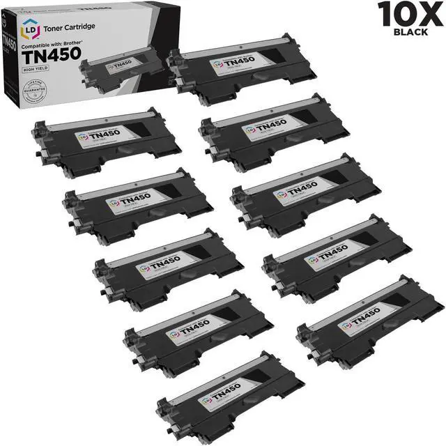 Save and print even more when you shop with LD Products! This offer includes 10 TN450 high yield black laser toner cartridges; they replace the TN420 standard yield cartridge. Why pay more for brand name Brother toner when our compatible printer supplies deliver excellent quality results for a fraction of the price? Each cartridge is 100% brand new and manufactured to meet or exceed the highest quality and performance standards.