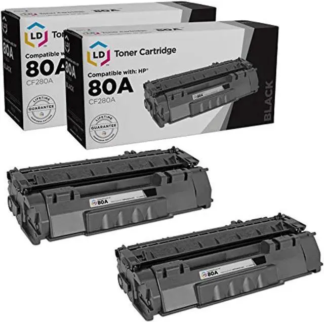 Save even more with our set of 2 compatible laser toner cartridges. Our compatible replacement for the Hewlett Packard CF280A (HP 80A) black laser toner cartridges are guaranteed to perform with your HP LaserJet Pro laser printer. They replace the original HP CF280A laser toner cartridge. This is not a remanufactured cartridge and it was not manufactured by HP. Our compatible replacement CF280A laser toner cartridge is specially engineered to meet the highest standards of quality and reliability. Our CF280A toner page yield meets or exceeds OEM (Original Equipment Manufacturer) page yield for the CF280A and offers high-quality printing results. The use of LD compatible replacement laser toner cartridges and supplies does not void your printers warranty. We offer a Two Year 100% Quality Satisfaction Guarantee on our LD compatible CF280A laser toner cartridges and supplies. This item works in the following HP LaserJet Pro 400 printers: M401dn, M401dw, M401n, and M425dn. We are the exclusive reseller of LD Products brand of high quality printing supplies on Newegg.