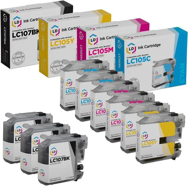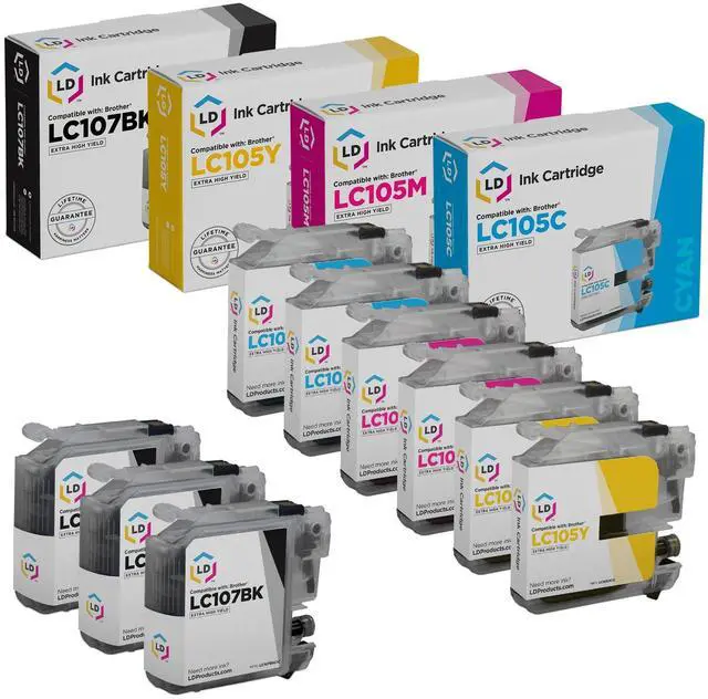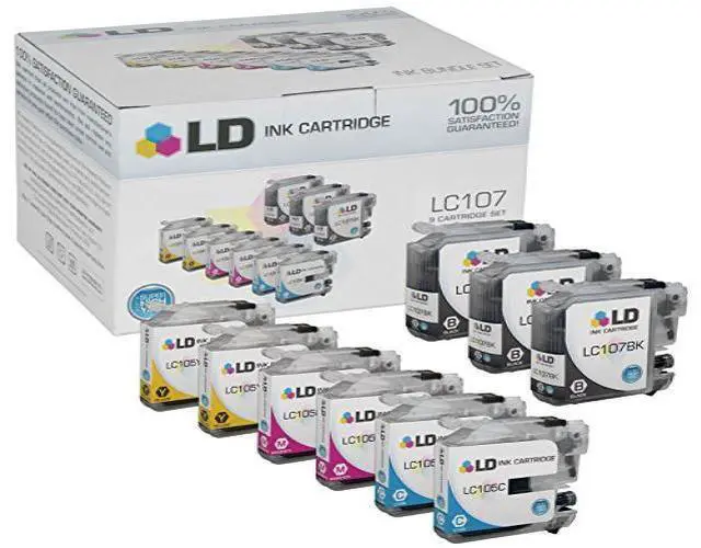 This 9 pack of Brother compatible ink cartridges includes 3 Black (LC107BK), 2 each of Cyan (LC105C), Magenta (LC105M) and Yellow (LC105Y) inkjet cartridges. Save even more with our 9 ink cartridge set for the Brother LC107 and LC105 series. Why pay twice as much for brand name Brother LC107 and LC105 black and color printer ink cartridges when our generic brand printer supplies are cheaper in price but equal in quality. All LD brand compatible cartridges are backed by a 2 year guarantee and ship fast! So Stock up now and save even more! LD © Cartridges are manufactured in an internationally certified ISO 9002 factory.