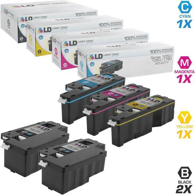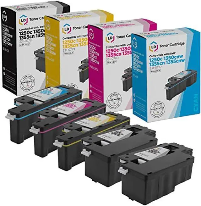 Save even more with our 5 pack compatible Dell laser toner cartridges. This set of 5 includes 2 black 3K9XM / 331-0778, 1 cyan FYFKF / 331-0777, 1 magenta 5GDTC / 331-0780, and 1 yellow DG1TR / 331-0779 laser toner cartridge. Why pay more for brand name Dell printer laser cartridges? So stock up now and save even more! This combo set is compatible with the following
