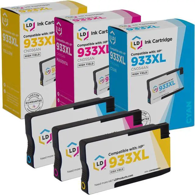 HP 933XL ink cartridges: This set of LD Remanufactured HP 933XL inkjet cartridges includes 1 cyan CN054AN, 1 magenta CN055AN and 1 yellow CN056AN inkjet cartridges. These LD Products remanufactured (HP 933XL) inkjet cartridges are original Hewlett Packard ink cartridges which have been through one cycle of service and have been recharged. Why buy original HP cartridges when you can get perfect quality out of our LD Products remanufactured inkjet cartridges at a fraction of the cost? Our remanufactured ink cartridges are not remanufactured by HP. For use in the following