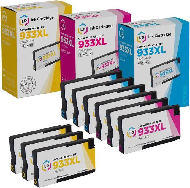 HP 933XL ink cartridges: This set of LD Remanufactured HP 933XL inkjet cartridges includes 3 cyan CN054AN, 3 magenta CN055AN and 3 yellow CN056AN inkjet cartridges. These LD Products remanufactured (HP 933XL) inkjet cartridges are original Hewlett Packard ink cartridges which have been through one cycle of service and have been recharged. Why buy original HP cartridges when you can get perfect quality out of our LD Products remanufactured inkjet cartridges at a fraction of the cost? Our remanufactured ink cartridges are not remanufactured by HP. For use in the following
