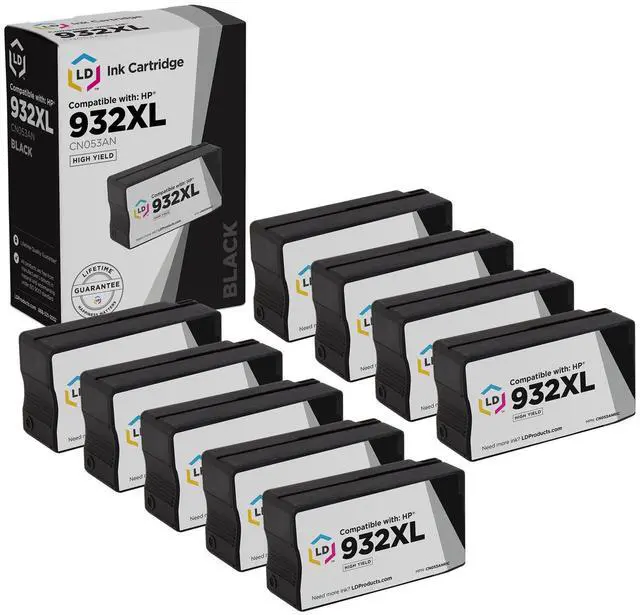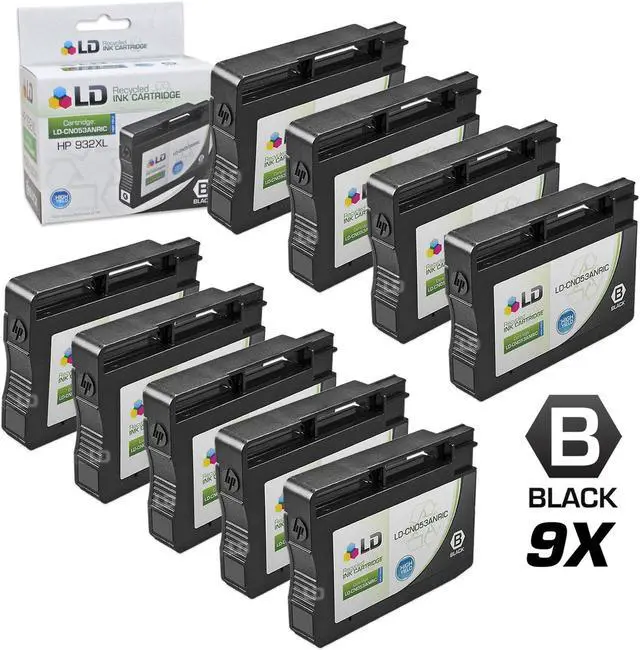 Save and print even more when you shop with LD Products! This offer includes (9) compatible replacements for CN053AN / HP 932XL black high yield ink cartridges. Why pay twice as much for expensive brand name ink when our compatible replacement printer supplies are backed by a 100% satisfaction and lifetime guarantee? For use in OfficeJet 6100, 6600, 6700, 7110 ePrinter, 7510, 7610, 7612, and 7620. Please note, retail packaging may vary, and these cartridges will only work with printers purchased within the United States and Canada. The use of compatible replacement cartridges and supplies does not void your printer’s warranty. Professionally manufactured by LD Products. HP is a registered trademark of HP Inc. and is not affiliated with and does not endorse LD Products.