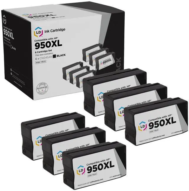Save and print even more when you shop with LD Products! This offer includes 6 CN045AN / 950xl black high yield compatible replacement ink cartridges. Why pay twice as much for expensive brand name ink when our compatible replacement printer supplies are backed by a 100% satisfaction and lifetime guarantee? Compatible with OfficeJet 8600, and OfficeJet Pro: 251dw, 276dw MFP, 8100, 8600, 8600 Plus, 8600 Premium, 8610, 8615, 8616, 8620, 8625, and 8630 printers. Please note, retail packaging may vary, and these cartridges will only work with printers purchased within the United States and Canada. The use of compatible replacement cartridges and supplies does not void your printer’s warranty. Professionally manufactured by LD Products. HP is a registered trademark of HP Inc. and is not affiliated with and does not endorse LD Products.