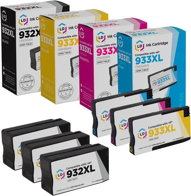 Save even more with our 8 pack of LD Products remanufactured HP 932XL and 933XL ink cartridges: This set of LD Remanufactured HP 932XL and 933XL inkjet cartridges includes 2 black CN053AN, 2 cyan CN054AN, 2 magenta CN055AN, and 2 yellow CN056AN inkjet cartridges. These LD Products remanufactured (HP 932XL and 933XL) inkjet cartridges are original Hewlett Packard ink cartridges which have been through one cycle of service and have been recharged. Why buy original HP cartridges when you can get perfect quality out of our LD Products remanufactured inkjet cartridges at a fraction of the cost? Our remanufactured ink cartridges are not remanufactured by HP. For use in the following