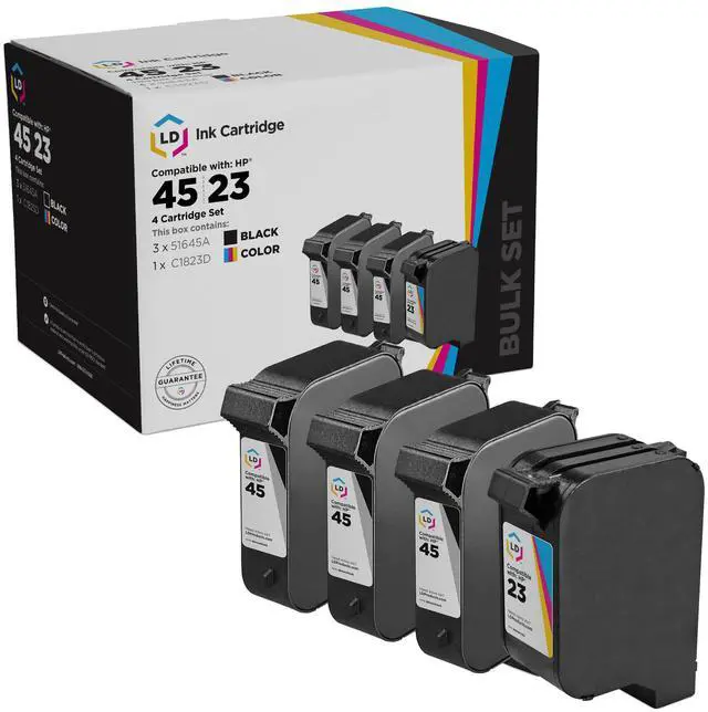 This package includes: 3 Black, 1 Tri-Color, 4-Packs. Why pay twice as much for brand name OEM HP 45 & 23 printer ink cartridges when our remanufactured printer supplies deliver excellent quality results for a fraction of the price? Our remanufactured brand replacement inkjet cartridges for HP printers are backed by our 100% Satisfaction and Lifetime Guarantee, so stock up no and Save and print even more! Our remanufactured ink cartridges are not remanufactured by HP. This combo set works with the following printers: HP Color Copier 140, 145, 150, 155, 160, 170, 260, 270, HP Deskjet 1120C, 1120cse, 1120cxi, 710, 710C, 712, 712C, 720, 720C, 722, 722C, 782, 782C, 815, 815C, 830, 830C, 832, 832C, 880, 880C, 882, 882C, 890, 890C, 890Cse, 890cxi, 895, 895cse, 895Cxi, HP OfficeJet 1170, 1170C, HP OfficeJet Pro 1170, 1170C, 1170Cse, 1170Cxi, 1175, 1175C, 1175Cse, 1175Cxi, HP OfficeJet R40, R60, R80, T45, T45xi, T46, T65, T65xi. We are the exclusive reseller of LD Products brand of high quality printing supplies on Amazon.
