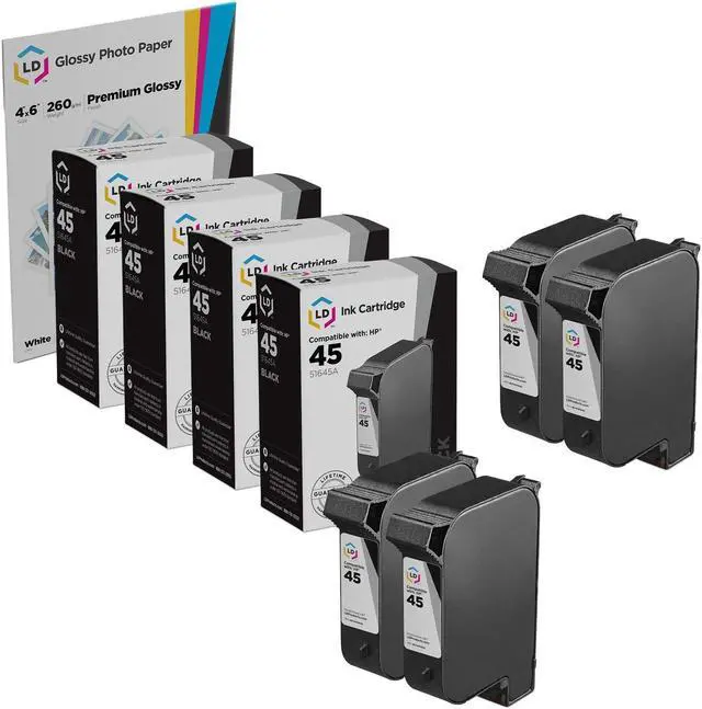 Includes 4 remanufactured high yield replacements for HP 45 black ink cartridges / HP 51645A black ink cartridges.