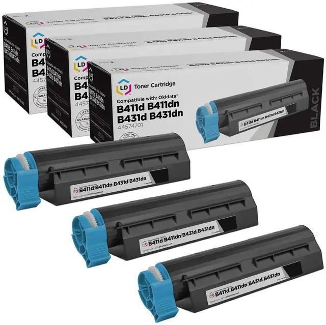 Save even more with our 3 pack compatible Okidata laser cartridges. This bulk set includes three 44574701 black laser toner cartridges. Save on our compatible replacement for the Okidata 44574701 black laser toner cartridges. Dont bother with expensive OEM Okidata 44574701 laser toner and take advantage of our compatible replacement for the Okidata laser toner which is guaranteed to work with your Okidata laser printer. Built to meet or exceed OEM (Original Equipment Manufacturer) standards, our compatible 44574701 toner offers exceptional yields and the highest quality printing results. Our compatible replacement for the Okidata 44574701 toner cartridge is manufactured 100% brand new, containing only new parts, including wiper blades and other internal parts. For use in the Okidata B411 and B431. The use of our replacement toner for the 44574701 does not void your printers warranty. You can depend on our compatible replacement for Okidata 44574701 laser toner cartridges which is backed by a 100% Satisfaction Guarantee!So stock up now and save even more! This combo set works with the following Okidata printers: MB461 MFP, MB471, MB471W, B411d, B411dn, B431d and B431dn. We are the exclusive reseller of LD Products brand of high quality printing supplies on Newegg.