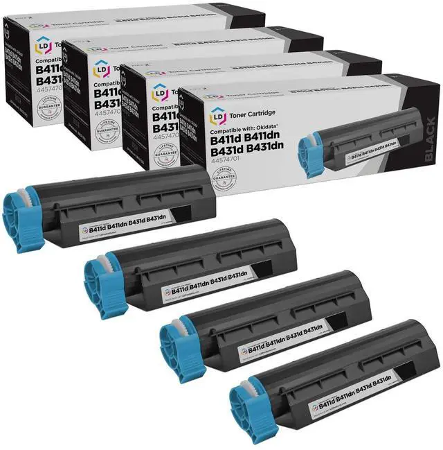 Save even more with our 4 pack compatible Okidata laser cartridges. This bulk set includes four 44574701 black laser toner cartridges. Save on our compatible replacement for the Okidata 44574701 black laser toner cartridges. Dont bother with expensive OEM Okidata 44574701 laser toner and take advantage of our compatible replacement for the Okidata laser toner which is guaranteed to work with your Okidata laser printer. Built to meet or exceed OEM (Original Equipment Manufacturer) standards, our compatible 44574701 toner offers exceptional yields and the highest quality printing results. Our compatible replacement for the Okidata 44574701 toner cartridge is manufactured 100% brand new, containing only new parts, including wiper blades and other internal parts. For use in the Okidata B411 and B431. The use of our replacement toner for the 44574701 does not void your printers warranty. You can depend on our compatible replacement for Okidata 44574701 laser toner cartridges which is backed by a 100% Satisfaction Guarantee!So stock up now and save even more! This combo set works with the following Okidata printers: MB461 MFP, MB471, MB471W, B411d, B411dn, B431d and B431dn. We are the exclusive reseller of LD Products brand of high quality printing supplies on Newegg.