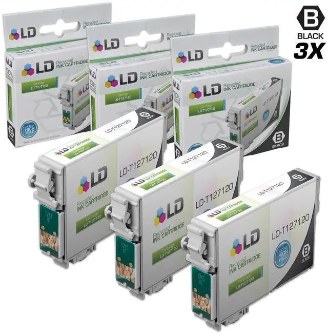 Save even more with our 3 extra high capacity ink cartridge set for the Epson T127 series. This set includes 3 Black T127120 (T1271) inkjet cartridges. Why pay twice as much for brand name OEM Epson T127 black printer ink cartridges when our remanufactured printer supplies deliver excellent quality results for a fraction of the price? Our remanufactured brand replacement inkjet cartridges for Epson printers are backed by a full 2 year 100% satisfaction guarantee. So Stock up now and save even more! For use in the following printers: Epson Stylus NX530, NX625, WORKFORCE 3520, 3530, 3540, 7010, 7510, 7520, 60, 545, 630, 633, 635, 645, 840 & 845. We are the exclusive reseller of LD Products brand of high quality printing supplies on Newegg.