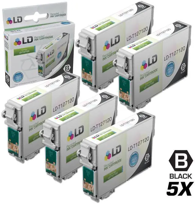 Save even more with our 5 extra high capacity ink cartridge set for the Epson T127 series. This set includes 5 Black T127120 (T1271) inkjet cartridges. Why pay twice as much for brand name OEM Epson T127 black printer ink cartridges when our remanufactured printer supplies deliver excellent quality results for a fraction of the price? Our remanufactured brand replacement inkjet cartridges for Epson printers are backed by a full 2 year 100% satisfaction guarantee. So Stock up now and save even more! For use in the following printers: Epson Stylus NX530, NX625, WORKFORCE 3520, 3530, 3540, 7010, 7510, 7520, 60, 545, 630, 633, 635, 645, 840 & 845. We are the exclusive reseller of LD Products brand of high quality printing supplies on Newegg.