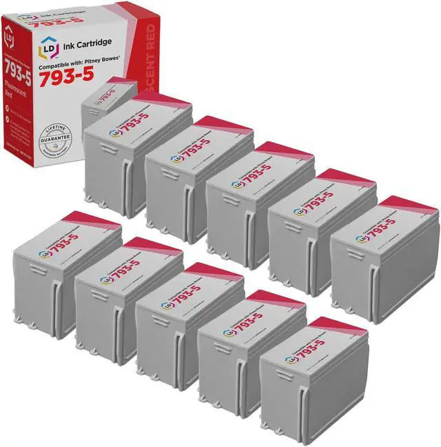 Save even more with our compatible ink cartridges. This listing contains 10 793-5 Fluorescent Red ink cartridges. Why pay more for brand name Pitney Bowes 793-5 printer ink cartridges? This combo set works in the following Pitney Bowes Digital Mailing and