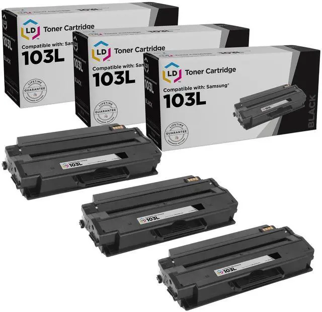 Save even more with our set of 3 Compatible high yield laser toner cartridges. This set includes 3 MLT-D103L high yield black laser toner cartridges. Why pay twice as much for brand name OEM Samsung MLT-D103L printer toner cartridges when our compatible printer supplies deliver excellent quality results for a fraction of the price? Our compatible brand replacement inkjet cartridges for Samsung printers are backed by a full 2 year 100% satisfaction guarantee. So stock up now and save even more! For use in the following