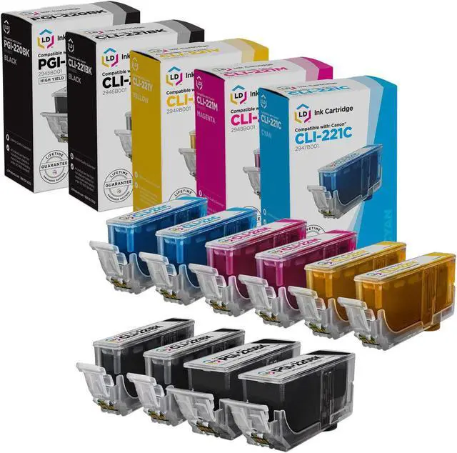 Save even more with our set of 10 compatible inkjet cartridges. This set includes 2 PGI220 (2945B001) Pigment Black, 2 CLI221 (2946B001) Dye Black, 2 CLI221 (2947B001) Cyan, 2 CLI221 (2948B001) Magenta, and 2 CLI221 (2949B001) Yellow inkjet cartridges. Why pay more for brand name Canon PGI220/CLI221 printer ink cartridges? This combo set works with the following