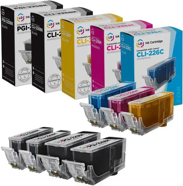 Save even more with our set of 7 compatible inkjet cartridges. This set includes 2 PGI225B (4530B001AA) Pigment Black, 2 CLI226B (4546B001AA) Dye Black, 1 CLI226C (4547B001AA) Cyan, 1 CLI226M (4548B001AA) Magenta, & 1 CLI226Y (4549B001AA) Yellow inkjet cartridges. Why pay more for brand name PGI225/CLI226 printer ink cartridges? This combo set works with the following
