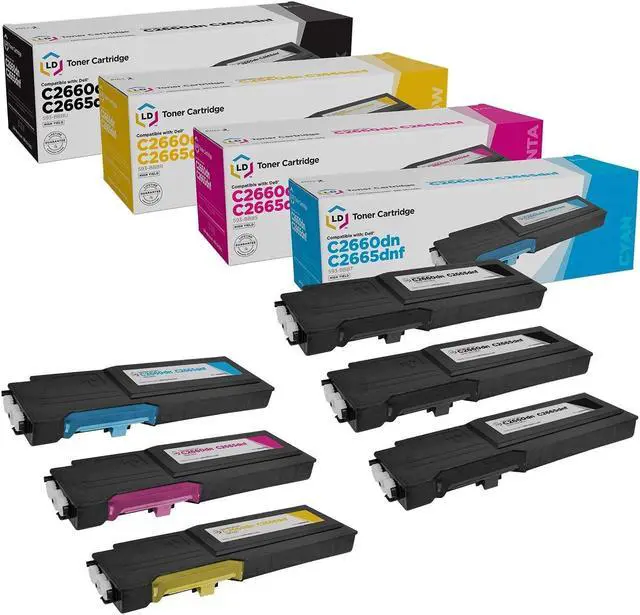 Save and print even more with our replacements for Dell 593 Toners. This offer includes 3 593-BBBU high yield black, 1 593-BBBT cyan, 1 593-BBBS magenta, & 1 593-BBBR yellow high yield toner cartridges, six compatible replacements for Dell 593 color laser toner cartridges. Why pay more for expensive brand name Dell toners? Compatible with Dell C2660dn & C2665dnf printers. Please note, retail packaging may vary, and these cartridges will only work with printers purchased within the United States and Canada. The use of replacement Dell 593 toner and supplies does not void your printers warranty.