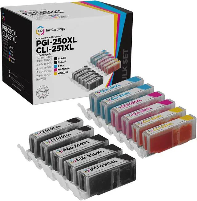 This Item Includes: (11-Pack, 3 Pigment Black, 2 Black, Cyan, Magenta, Yellow) Compatible Ink Cartridges Replacement for Canon PGI-250XL & CLI-251XL Set of 11 High Yield. Why pay more for brand name when our Compatible printer supplies deliver excellent quality results for a fraction of the price? Our So stock up now and save even more! Enjoy the best prices on our top-rated ink cartridge replacements. Take advantage of even bigger savings when you shop high yield? ink cartridges that allow you to print more pages. Keep printing longer for a lower price. We offer printer cartridges for hard-to-find printer models. Our cartridges are good for? home, office or when you're running a business? Our products are put through a rigorous testing process where? they are monitored for quality and reliability. Knowing the? ink cartridge that works? most efficiently with your printer model can save you a ton of money in the long run. Please note, retail packaging may vary and these cartridges will only work with printers purchased within the United States and Canada. The use of compatible cartridges does not void your printer's warranty and our cartridges are not manufactured by Canon.