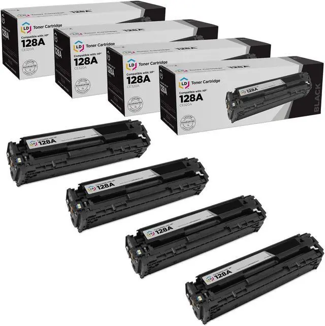 Save even more with our remanufactured laser toner cartridges. This listing contains 4 CE320A Black ink cartridges. Why pay more for brand name Hewlett Packard 128A printer toner cartridges when our remanufactured printer supplies deliver excellent quality results for a fraction of the price? This combo set works with the following HP Color LaserJet and