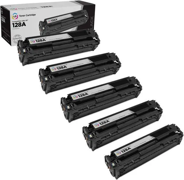 Save even more with our remanufactured laser toner cartridges. This listing contains 5 CE320A Black ink cartridges. Why pay more for brand name Hewlett Packard 128A printer toner cartridges when our remanufactured printer supplies deliver excellent quality results for a fraction of the price? Our remanufactured ink cartridges are not manufactured by HP. So stock up now and save even more! This combo set works with the following HP Color LaserJet and