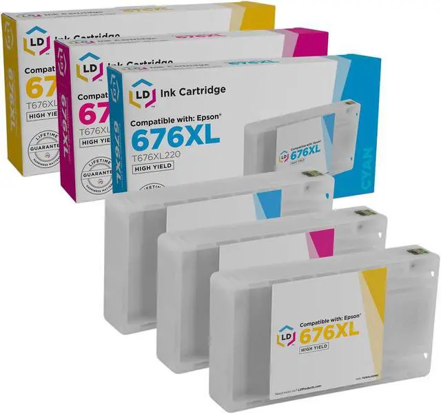 Save and print even more with our replacements for Epson 676XL T676XL120 Ink cartridges. This offer includes 3 pack of remanufactured replacements for epson wp4530 ink cartridges: (1) T676XL220 Cyan, (1) T676XL30 Magenta, and (1) T676XL420 Yellow. Why pay more for expensive brand name T676XL ink? Compatible with WorkForce WP-4020, WorkForce WP-4530, WorkForce WP-4540 | WorkForce Pro WP-4010, WorkForce Pro WP-4023, WorkForce Pro WP-4090, WorkForce Pro WP-4520, WorkForce Pro WP-4533, and WorkForce Pro WP-4590 printers. Please note, retail packaging may vary, and these cartridges will only work with printers purchased within the United States and Canada. The use of replacement for epson wp 4020 ink and supplies does not void your printers warranty. Epson is a registered trademark of SEIKO EPSON KABUSHIKI KAISHA Corporation and is not affiliated with and does not endorse LD Products. Professionally remanufactured by LD Products.