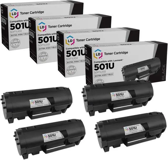 Save even more with our set of 4 compatible laser toner cartridges. This set includes 4 50F1U00 ultra high yield black laser toner cartridges. Why pay more for brand name Lexmark 501U cartridge? This set works in the following