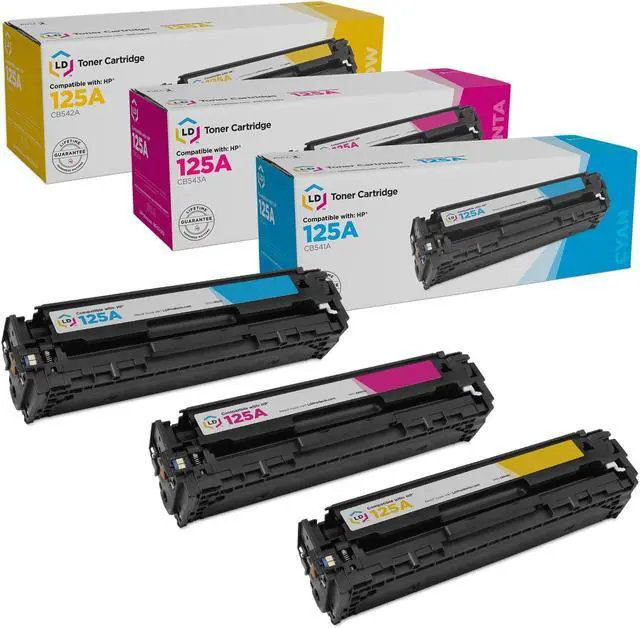Save even more with our set of 3 remanufactured laser toner cartridges. This set includes 1 CB541A Cyan, 1 CB542A Magenta, and 1 CB543A Yellow laser toner cartridges. Why pay more for brand name Hewlett Packard 125A toner cartridges when our remanufactured printer supplies deliver excellent quality results for a fraction of the price? our remanufactured brand replacement toner cartridges for HP are built to perform. So stock up now and save even more! our remanufactured ink cartridges are not manufactured by HP. This set works in the following HP