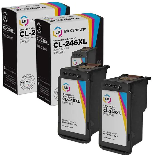 Save even more with our set of 2 remanufactured inkjet cartridges. This set includes 2 8280B001AA High Yield Color inkjet cartridges. Why pay twice as much for brand name Canon CL-246XL cartridge when our remanufactured printer supplies deliver excellent quality results for a fraction of the price? Our remanufactured cartridges for Canon are backed by a full 2 year 100% satisfaction guarantee. So stock up now and save even more! This set works in the following Canon PIXMA Printers: iP2820, MG2420, MG2520, MG2920, MG2922, MG2924, MX490, and MX492. Please note, retail packaging may vary and this item will only work with printers purchased within the United States and Canada. We are the exclusive reseller of LD Products brand of high quality printing supplies on Newegg.