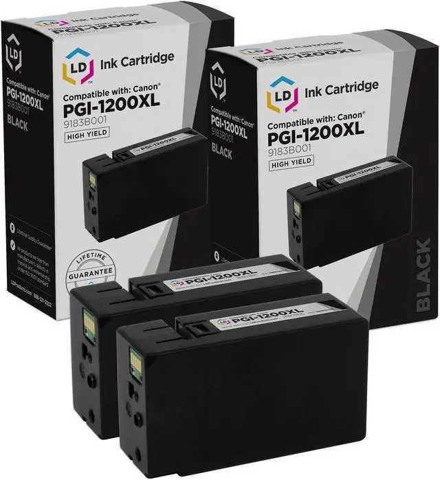 Save even more with our set of 2 compatible inkjet cartridges. This set includes 2 9183B001 Black inkjet cartridges. Why pay more for brand name Canon PGI-1200XL cartridge? This set works in the following