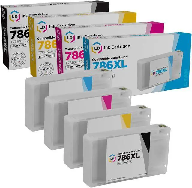Save and print even more when you shop with LD Products! This offer includes (1) T786XL120 High Yield Black, (1) T786XL220 High Yield Cyan, (1) T786XL320 High Yield Magenta and (1) T786XL420 High Yield Yellow ink cartridges; they replace the 786 / T786120 black, T786220 cyan, T786320 magenta and T786420 yellow Standard Yield ink cartridges. Why pay more for expensive brand name Epson ink? This ink cartridge set is compatible with Epson WF-4630, WF-4640, WF-5110, WF-5190, WF-5620, WF-5690, WorkForce: WF-4630, WF-4640, WF-5110, WF-5190, WF-5620, WF-5690 and