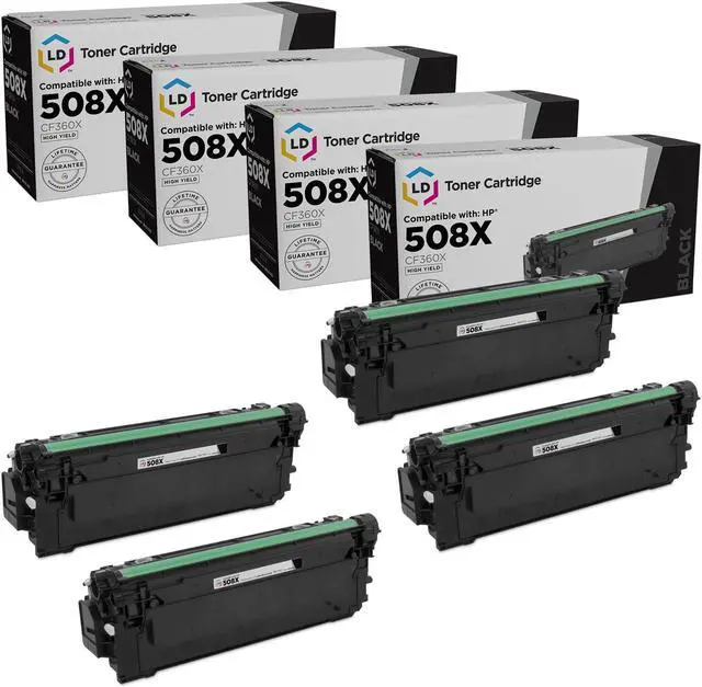 Save even more with our compatible laser toner cartridges. This listing contains 4 CF360X high yield black laser toner cartridges. Why pay more for brand name HP 508X Cartridge when our compatible printer supplies deliver excellent quality for a fraction of the price? Our compatible cartridges for Hewlett Packard are built to perform. So stock up now and save even more! This is not a remanufactured cartridge and it was not manufactured by HP. This set works in the in the following