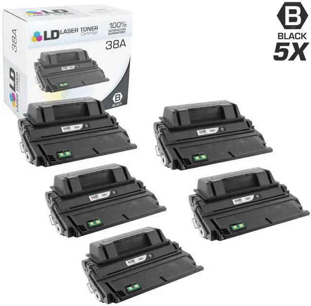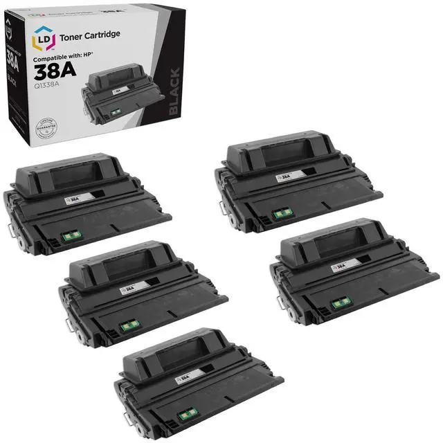 This listing contains 5 Q1338A black laser toner cartridges. Our compatible cartridges for Hewlett Packard are built to perform. This is not a remanufactured cartridge and it was not manufactured by HP. This set works in the following