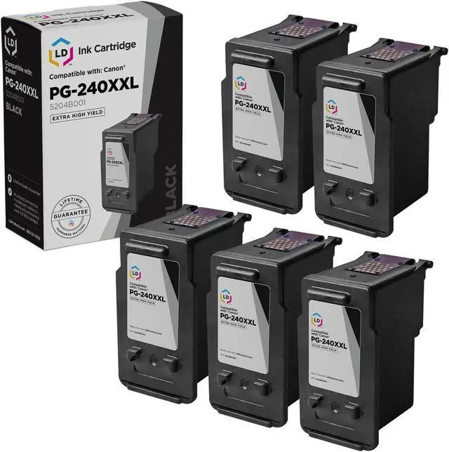 Save even more with our remanufactured inkjet cartridges. This listing contains 5 5204B001 Extra High Yield black cartridges. Why pay more for brand name Canon PG-240XXL Cartridge when our remanufactured printer supplies deliver excellent quality for a fraction of the price? Our remanufactured cartridges for Canon are built to perform. So stock up now and save even more! This set works in the following
