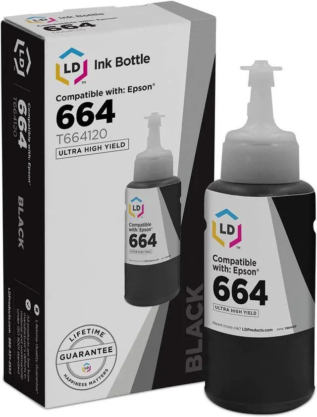 Save even more with our remanufactured ink bottle. This listing contains 1 T664120 black ink bottle. Why pay more for brand name Epson 664 bottle when our remanufactured printer supplies deliver excellent quality for a fraction of the price? This item is compatible with Epson Expression ET-2500, ET-2550, ET-4500 and Workforce ET-16500, ET-4500, ET-4550. Please note, retail packaging may vary and this item will only work with printers purchased within the United States and Canada.