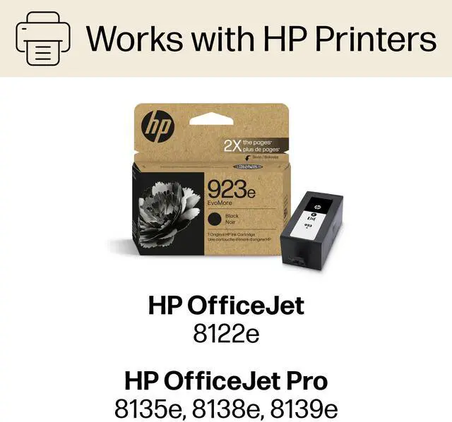 See how at http: //hp. com/EvoMoreCommunity. Disclaimers For OfficeJet and OfficeJet Pro 8120 and 8130 series printers when compared to standard Original HP Ink Cartridges for the same printer. See www. hp. com/EvoMoreLCA. HP 923e/924e/925e EvoMore Ink Cartridges have a lower carbon footprint compared to standard 923/924/925 Original Ink Cartridges when normalized to print 1, 000 pages. Based on LCA study conforming to ISO 14040/44 and third party verified. See www. hp. com/EvoMoreLCA HP 923e/924e/925e EvoMore Original Ink Cartridges compared to HP 923/924/925 standard Original Ink Cartridges. Page yield tested in HP OfficeJet Pro 8120 series. Average continuous printing yield of black and composite (cyan/magenta/yellow) based on ISO/IEC 24711 or HP testing methodology. Actual yield varies considerably based on content of printed pages and other factors. For details, see