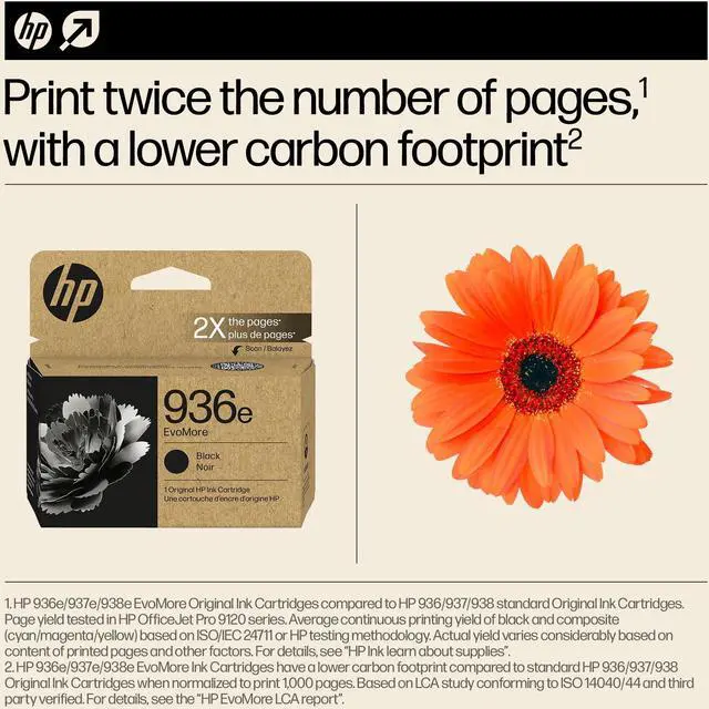 See how at http: //hp. com/EvoMoreCommunity. Disclaimers For OfficeJet Pro 9100 and 9700 series printers when compared to standard Original HP Ink Cartridges for the same printer. See www. hp. com/EvoMoreLCA. HP 936e/937e/938e EvoMore Ink Cartridges have a lower carbon footprint compared to standard HP 936/937/938 Original Ink Cartridges when normalized to print 1, 000 pages. Based on LCA study conforming to ISO 14040/44 and third party verified. See www. hp. com/EvoMoreLCA HP 936e/937e/938e EvoMore Original Ink Cartridges compared to HP 936/937/938 standard Original Ink Cartridges. Page yield tested in HP OfficeJet Pro 9120 series. Average continuous printing yield of black and composite (cyan/magenta/yellow) based on ISO/IEC 24711 or HP testing methodology. Actual yield varies considerably based on content of printed pages and other factors. For details, see