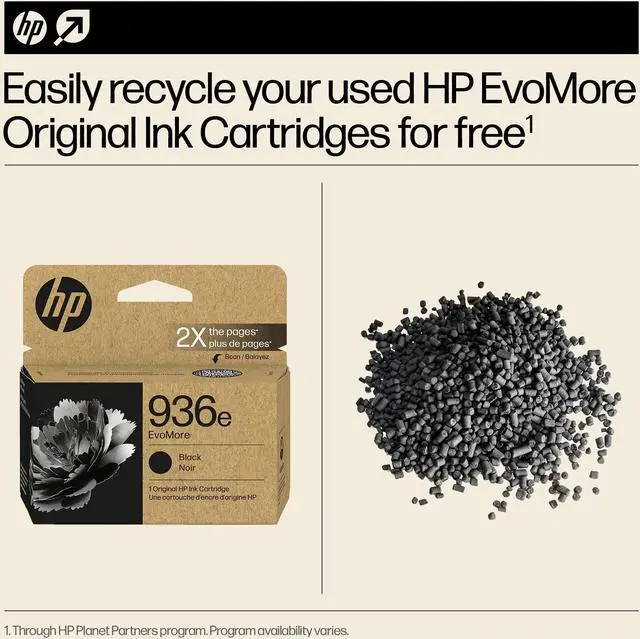 http: //www. hp. com/learnaboutsupplies. Program availability varies. See www. hp. com/recycle. Original HP Ink Cartridge certification to UL 2801 demonstrates compliance with a range of multi-attribute, lifecycle-based criteria related to human health and environmental considerations. May vary by product, see UL. com/EL & KeypointIntelligence. com/HPInkUL for list. Climate Impact Partners, The CarbonNeutral Protocol, certified CarbonNeutral product, 2024 edition, https: //www. carbonneutral. com/the-carbonneutral-protocol. The Lifecycle Assessments (LCA) are verified by independent third parties and comply with ISO 14040 and ISO 14044. HP uses these tests to determine the carbon footprint of the cartridges. We use this data to calculate the cartridge's CO emissions. Recycling compared to request-an-envelope process for standard Original HP Ink Cartridges for the same printer. Applies to HP 936e, 937e EvoMore Ink Cartridges. Only available in countries where cartridges can be returned through the mail. See hp. com/EvoMore for details. Customers can also drop off cartridges at collection sites. HP Planet Partners Program availability varies. For more information, visit www. hp. com/hprecycle. 2021 RPET and RPP Four Elements Consulting Life Cycle Assessment (LCA), commissioned by HP. Packaging is the box that comes with the product. This contains at least 90% of recycled fibers by total weight and can be recycled in your local paper/carton recycling bin. Consult your local guidelines. The HP EvoMore Community is a compensation program to help offset the impact of HPs environmental activities by supporting large-scale reforestation efforts to restore high priority forests and wildlife habitats