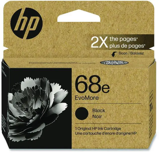 See https: //hp. com/EvoMoreLCA. Original HP 68e EvoMore Ink Cartridges have two times the pages compared to Original HP 68 standard Ink Cartridges. Page yield tested in HP Envy 6155e All-in-One Printer. Average continuous printing yield of black based on ISO/IEC 24711 or HP testing methodology. Actual yield varies considerably based on content of printed pages and other factors. For details, see