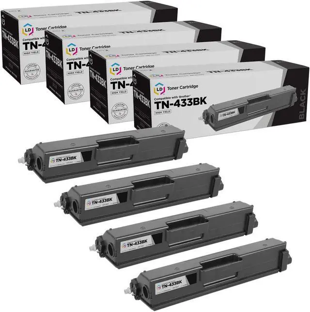Item Includes: Replacement Toner Cartridge Compatible with Brother TN433BK High Yield (Black, 4-Pack) Why pay more for brand name Brother TN433 / TN433BK cartridge when our Compatible printer supplies deliver excellent quality results for a fraction of the price? This is a remanufactured cartridge and it was not manufactured by Brother. This set works in the following Brother Printers HL-L8260CDW, HL-L8360CDW, HL-L8360CDWT, HL-L9310CDW, HL-L9310CDWT, HL-L9310CDWTT | MFC-L8610CDW, MFC-L8900CDW, MFC-L9570CDW, MFC-L9570CDWT. Our cartridges are good for home, office or when you're running a business. Our products are put through a rigorous testing process where they are monitored for quality and reliability. Knowing the toner cartridge that works most efficiently with your printer model is important. Please note, retail packaging may vary and these cartridges will only work with printers purchased within the United States and Canada. The use of compatible cartridges does not void your printers warranty and our cartridges are not manufactured by Brother. We are the exclusive reseller of LD Products brand of high-quality printing supplies.
