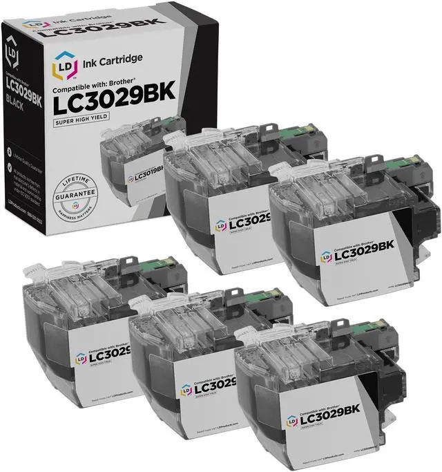 Save and print even more when you shop with LD Products! This listing includes (5) LC3029BK / LC3029 super high yield series black ink cartridges. Why pay more for brand name Brother ink? This ink cartridge set is compatible with Brother MFC-J5830DW, MFC-J5830DWXL, MFC-J5930DW, MFC-J6535DW, MFC-J6535DWXL and MFC-J6935DW printers. Please note, retail packaging may vary and these cartridges will only work with printers purchased within the United States and Canada. The use of compatible printing supplies does not void your printer warranty. We are the exclusive reseller of LD Products brand of high quality printing supplies.