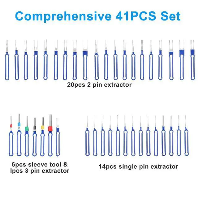 Comprehensive 41PCS Set: Receive a 41-piece electrical pin removal toolkit, featuring 14 single-pin pullers, 20 double-pin pullers, 1 triple-pin puller, 6 sleeve tools, and a protective bag for convenient storage and portability.