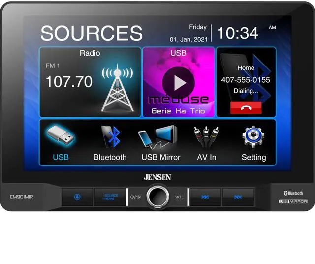 Jensen CM901MIR 9 Inch Digital Multimedia Receiver with USB Screen Mirroring Does not play discs Jensen s CM901MIR digital multimedia receiver provides you with an expansive 9 screen to let you enjoy these features in your car The CM901MIR s built in Bluetooth wireless technology adds the convenience you ve come to expect You ll be able to access your phonebook and make hands free calls plus stream music complete with artist information Product Highlights Digital multimedia receiver with AM FM tuner does not play discs 9 LCD touchscreen display Bluetooth for hands free calling and audio streaming Fits double DIN dash openings Smartphone Features USB screen mirroring with Apple or Android phones Audio Mix allows additional audio source playback while in mirroring mode Push to talk button for smartphone assistant Audio video Features MP3 MP4 Xvid and FLAC file playback via USB 8 preset EQ curves Expandability Inputs front USB input rear A V input RCA backup camera Outputs 6 channel preamp 4 volt front rear sub Other Information Wired connection to parking brake required to access settings and other features on this receiver Built in internal amp 16 watts RMS x 4 channels 50 watts peak Compatible with most factory steering wheel audio controls adapter required CTA 2006 compliant
