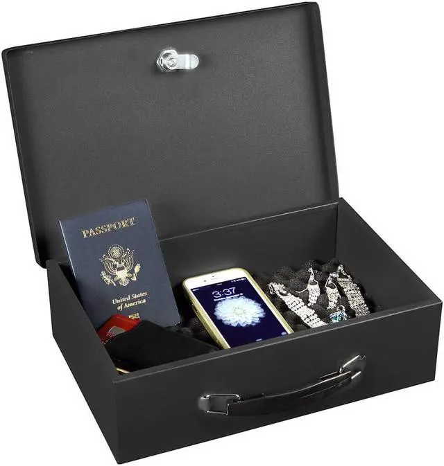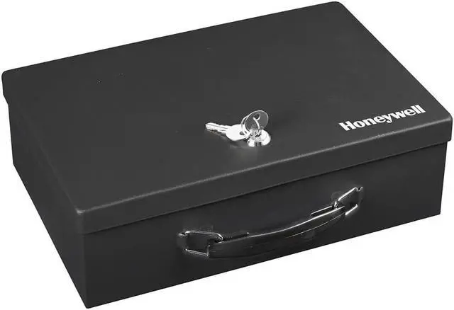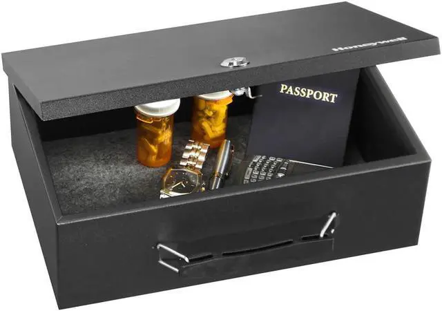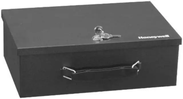 - FEATURES - The Honeywell 6104 security boxs concealed hinge keeps your small valuables protected from users by preventing prying of the door. This box includes a foam padded floor mat and is built with a sturdy double steel wall construction and is equipped with a fire resistant insulation. With 0. 17 cubic feet of interior storage space, this key-locking security box is perfect for holding small documents and valuables. The exterior dimensions are 3. 9 in H x 12. 7 in W x 9. 0 in D